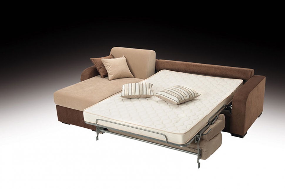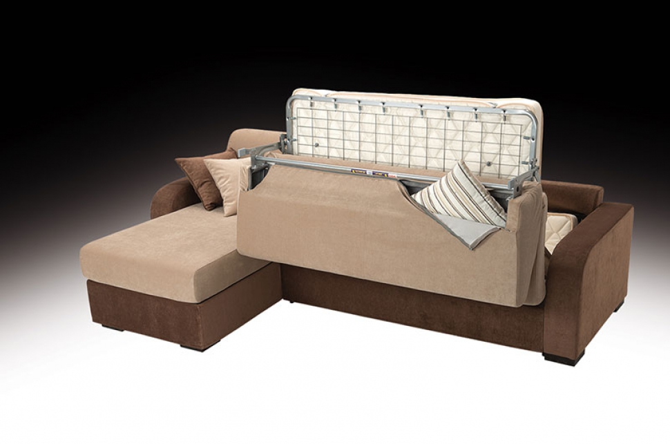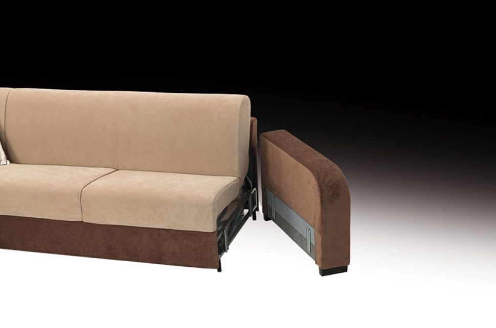 Meccanismo letto in acciaio strutturale con apertura mediante capovolgimento anteriore dello schienale e delle sedute senza rimozione degli elementi di tappezzeria.