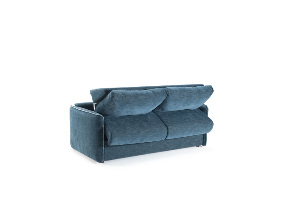 Meccanismo letto in acciaio strutturale con apertura mediante capovolgimento anteriore dello schienale e delle sedute senza rimozione degli elementi di tappezzeria.