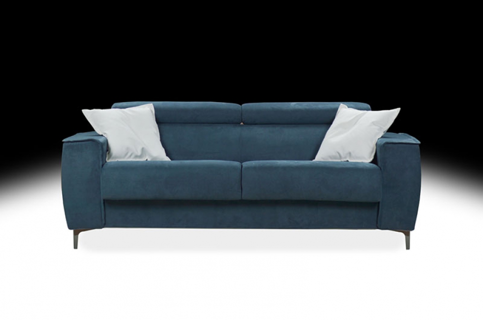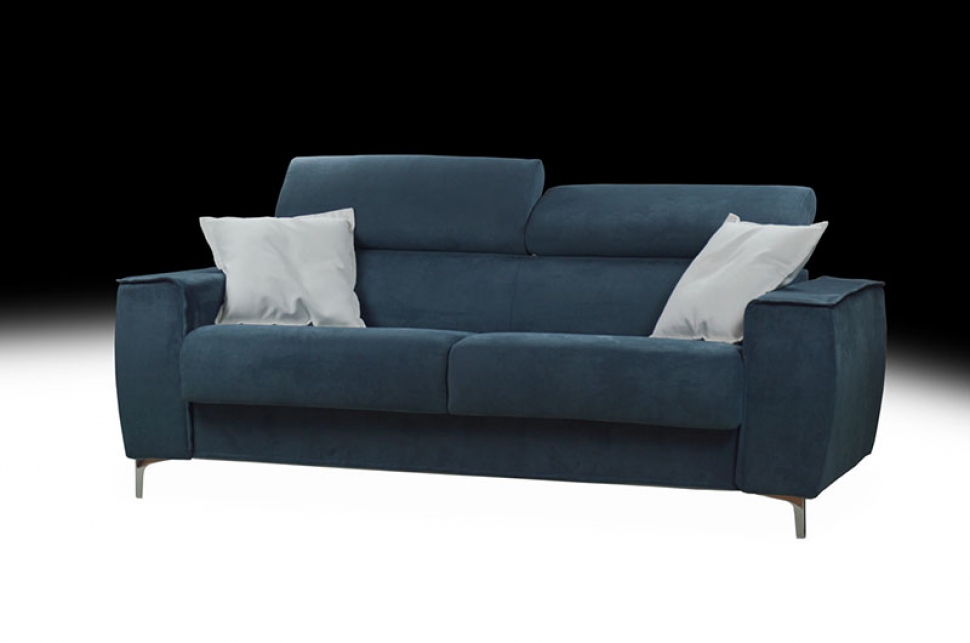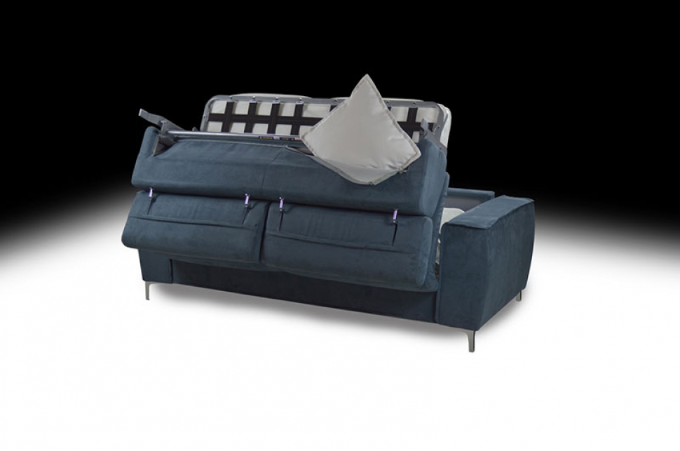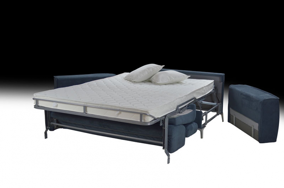 Meccanismo letto in acciaio strutturale con apertura mediante capovolgimento anteriore dello schienale e delle sedute senza rimozione degli elementi di tappezzeria.
