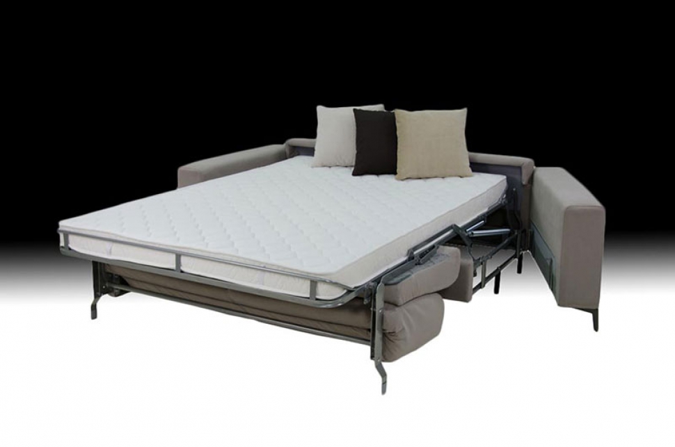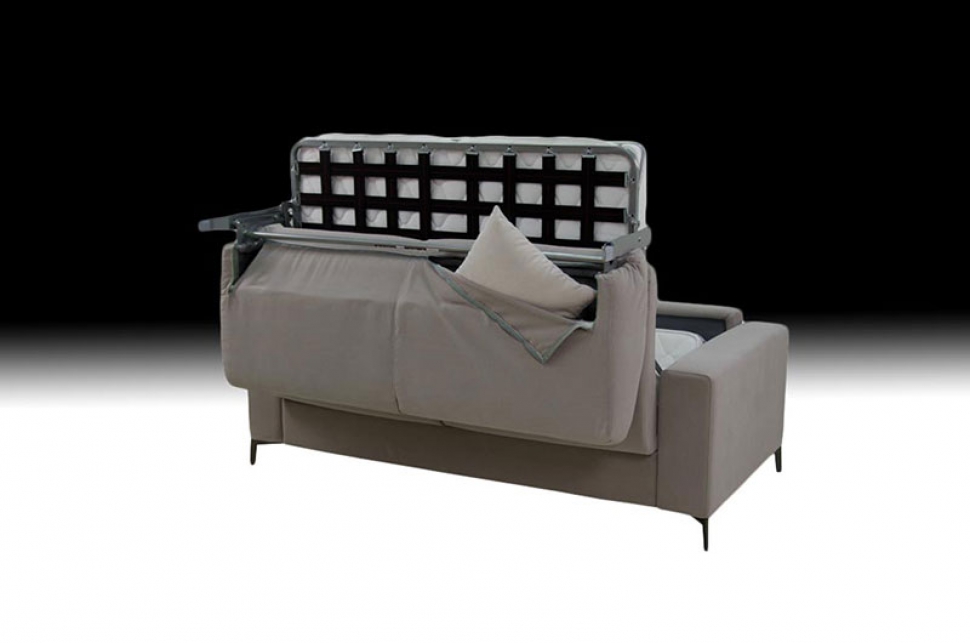 Meccanismo letto in acciaio strutturale con apertura mediante capovolgimento anteriore dello schienale e delle sedute senza rimozione degli elementi di tappezzeria.