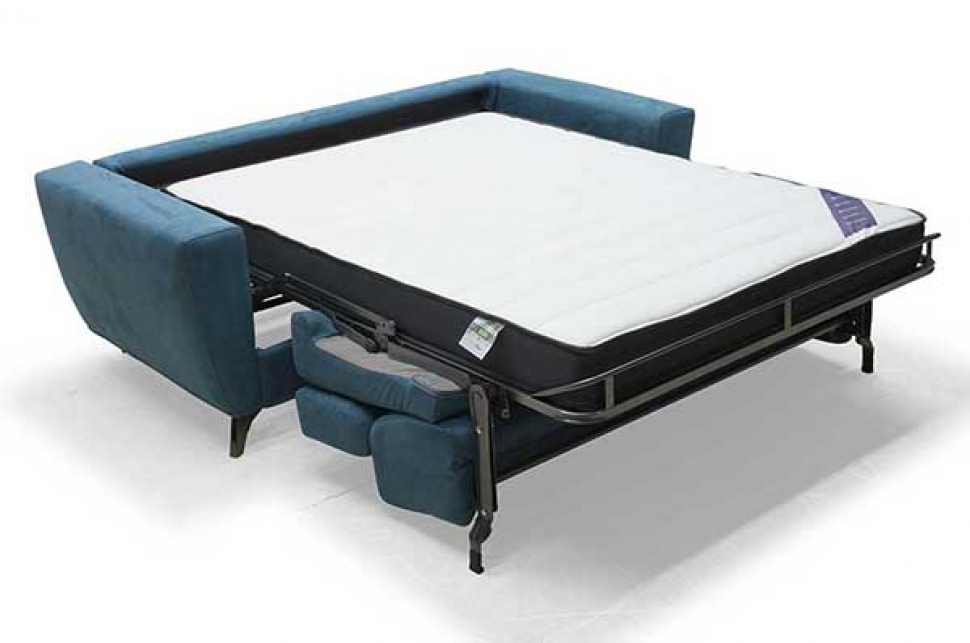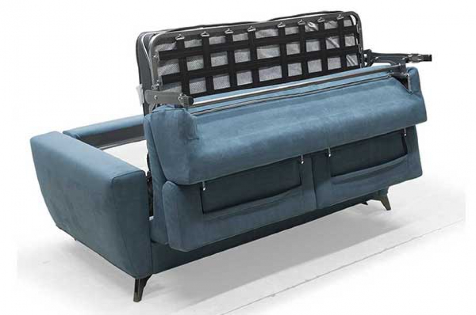 Meccanismo letto in acciaio strutturale con apertura mediante capovolgimento anteriore dello schienale e delle sedute senza rimozione degli elementi di tappezzeria.