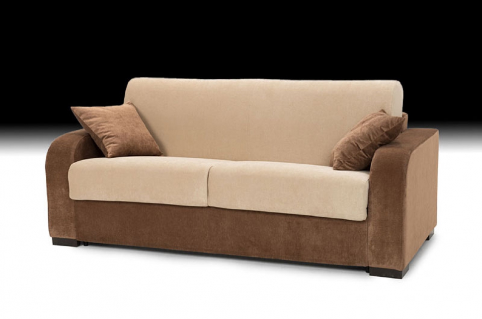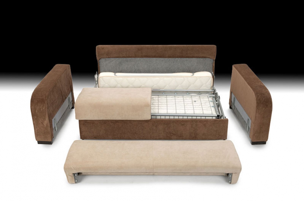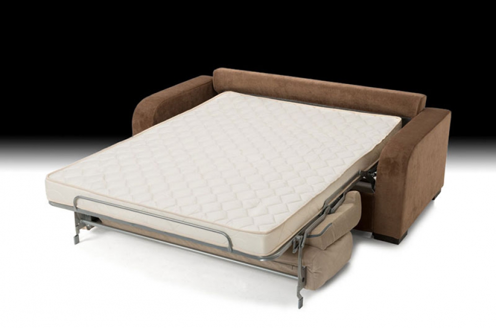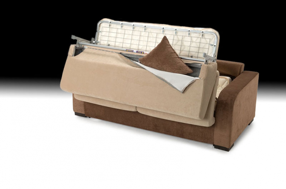 Meccanismo letto in acciaio strutturale con apertura mediante capovolgimento anteriore dello schienale e delle sedute senza rimozione degli elementi di tappezzeria.