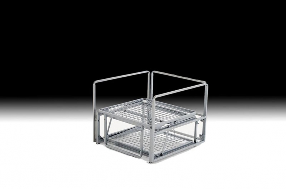 Meccanismo in acciaio strutturale, dotato di 2 ruote su un lato per poterlo spostare facilmente, piano letto in maglia elettrosaldata.