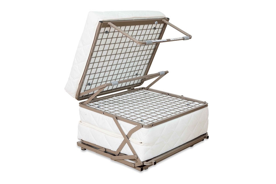 Meccanismo in acciaio strutturale, dotato di 2 ruote su un lato per poterlo spostare facilmente, piano letto in maglia elettrosaldata.